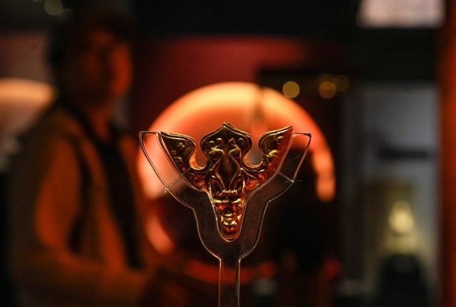 2021年度全国十大考古新发现——汉文帝霸陵出土的文物也是首次进京。一件凤鸟纹龙首金花饰结构精妙,整体外形宛如一朵扁状柿蒂花,表面浮雕龙首,尽显威严气势,龙角向后延伸,两侧各饰一只灵动凤鸟,翩然欲飞。鎏金铜磬架、鎏金天马纹银当卢等一批金银器,则展现了当时的工艺水平,是多元文化交流融合的见证。